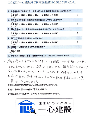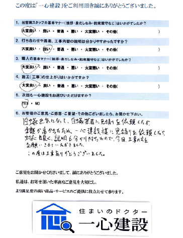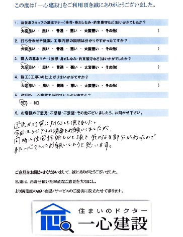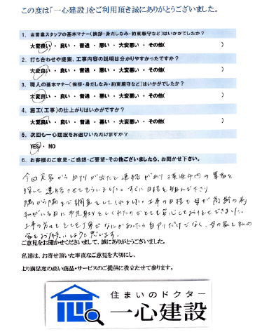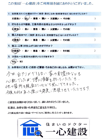 今回はシロアリの消毒をお願いしましたが、同時に住宅診断をして頂き気になる部分があったのでまた一心さんにお願いしようと思います。